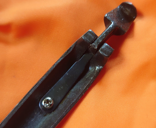 ▲留め金部の板バネをプラスネジで固定しているのが村久の製品の特徴。他のメーカーはリベットで固定している。同じ村久でも古い製品になるとマイナスネジが使われている。